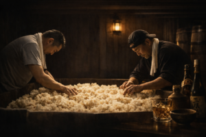 職人が黙々と麹と向き合う姿。